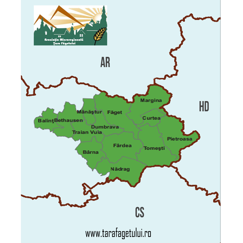 Microregiunea Ţara Făgetului este aşezată in vestul României, în partea estică a judeţului Timiş si in partea estica a judetului Arad, fiind o regiune organizată în jurul oraşului Făget, denumit si orasul castanilor, oras care este un reper foarte important din punct de vedere economic si al furnizarii serviciilor de baza pentru asezarile teritoriului GAL. Teritoriul este străbătut de Drumul European E673 si DN7, iar in imediata apropiere fiind si autostrada dinspre comuna Traian Vuia si continua la intrarea în comuna Margina, fiind un atu din punct de vedere al transportului și circulatiei auto. Pozitia geografica asigura un grad de deschidere determinant pentru viitorul sau și un atu major care formează o zonă de contacte, mai ales datorita apropierii de autostrada. Scurtă descriere a teritoriului acoperit de parteneriat: Comunele ce alcătuiesc zona sunt următoarele: Pietroasa (cu satele Crivina de Sus, Poieni, Fărăşeşti), Tomeşti (cu satele Luncanii de Sus, Luncanii de Jos, Baloşeşti, Colonia Fabrică, Româneşti), Curtea (cu satele Homojdia, Coşava), Margina (cu satele Coşeviţa, Breazova, Zarani, Sinteşti, Nemeşeşti, Coşteiul de Sus, Groşi, Bulza), Balinţ (cu satele Fădimac, Bodo, Târgovişte), Dumbrava (cu satele Răchita, Bucovăţ), Mănăştiur (cu satele Remetea-Luncă, Pădurani, Topla), Nădrag (cu satul Crivina), Bethausen (cu satele Cladova, Cliciova, Cutina, Leucuşeşti, Nevrincea), Bârna (cu satele Boteşti, Botineşti, Drinova, Jureşti, Pogăneşti, Sărăzani), Traian Vuia (cu satele Sudriaş, Jupani, Susani, Săceni, Surducu Mic) Fîrdea (cu satele Hauzeşti, Gladna Montană, Gladna Română, Zolt, Mâtnicu-Mic, Drăgsineşti) și orașul Făget (cu satele Băteşti, Brăneşti, Jupâneşti, Bichigi, Povergina, Bunea Mare, Bunea Mică, Temereşti, Begheiul Mic, Colonia Mică). Relieful este deluros, respective muntos, facand parte din zona dealurilor Lugojului şi a munţilor Poiana Ruscăi. Microregiunea este o zonă cu o mare valoare naturală şi peisajistică. Înzestrată cu un relief variat şi cu o bogată reţea hidrografică, zona situată pe golful Lugojului în punctul de contact al dealurilor cu regiunea muntoasă, se învecinează la nord cu zona etnografica Lipova, la est cu zona Pădureni din judeţul Hunedoara, în sud peste versanţii munţilor Poiana Ruscăi, cu zona etnografica Bistra, iar în vest cu zona etnografica Lugoj. Dintre formele de atracţie Naturală care se găsesc în zonă putem aminti: Stancile, Pesterile, Poienile, Izvoarele (inclusive izvoare termale), Văile, Cascadele, Râurile şi Pârâurile. Regiunea este străbătută de râul Bega. Clima teritoriului este o climă specifica zonei de vest a Romaniei, cu o complexă interferenţă morfoclimatică (montan, piemontan şi luncă) unde energia solară se repartizează diferenţiat iar circulaţia maselor de aer vestice şi nord-vestice îi dă anumite particularităţi ce se pot regrupa etajat de la zonă montană la zonă de luncă. Resursele pe care se bazeaza potentialul economic al microregiunii sunt resurse proprii (terenuri arabile, pasuni, fanete, paduri, produse animaliere si vegetale), lemnul din zona. Toate acestea sunt necesare pentru reţeaua întreprinderilor de producţie și servicii. Flora şi fauna sălbatică este diversificată și specifică zonei de interferenta deal/munte din estul judetului Timis. Pasunile limitrofe padurilor sunt acoperite in proportie de 50% cu arbusti diversi- mesteacan, stejar, plop, paducel iar murul si macesul sunt prezente pe toate pasunile din regiune. Padurile din zona de deal sunt acoperite cu arbori de diferite esente cum ar fi : cer, gorun, stejar, carpen, fag, salcam, tei si cires salbatic, iar plantele intalnite in aceste paduri sunt: feriga, ghimpele, diverse plante medicinale precum păducel, rostopasca, urzica, lumânărica, etc. În regiune putem întâlni şi importante plantaţii de castani. Agricultura reprezintă principala activitate și o sursă importantă de venit pentru o mare parte a populației teritoriului GAL, populația activă din sectorul agricol fiind de 15.220 locuitori, ceea ce reprezinta 49,61% din total populație. Din suprafața totală agricolă de 57.595,80 ha, categoria de folosință arabil este de 33.552,09 ha, pășunile și fânețele sunt în suprafață de 23.238,06, iar vița de vie și livezile reprezintă 805,65 ha.Din total suprafață agricolă, ponderea cea mai mare o au terenurile arabile în procent de 58,25 %.Ca și pondere în structura culturilor, cerealele și oleaginoasele sunt cultivate pe suprafețele cele mai mare, urmate de legume. În ceea ce privește sectorul zootehnic, efectivul de animale este de 60.453 capete. Numărul total al locuitorilor care fac parte din aria teritorială a Grupului de Actiune Locala Asociația Microregională Țara Făgetului este conform RPL 2011 de 30.608 locuitori, dispuşi pe o suprafaţă totală de 1.281,81 km2 . Teritoriul acoperit de Grupul de Acţiune Locală Asociația Microregională Țara Făgetului, are o densitate de 23,9 locuitori/km2, inferioară densităţii judeţului Timiş (78,6 locuitori/km2), densităţii regiunii de dezvoltare Vest (57,1 locuitori/km2), cât şi celei de la nivel naţional (84,4 locuitori/km2), ceea ce prioritizează atragerea populaţiei în zonele rurale în primul rând prin îmbunătăţirea calitații vieții din mediul rural, dar şi prin crearea de locuri de muncă.